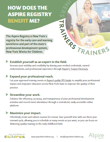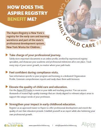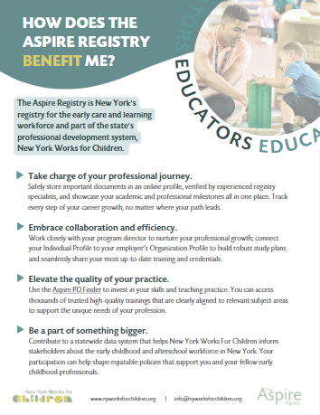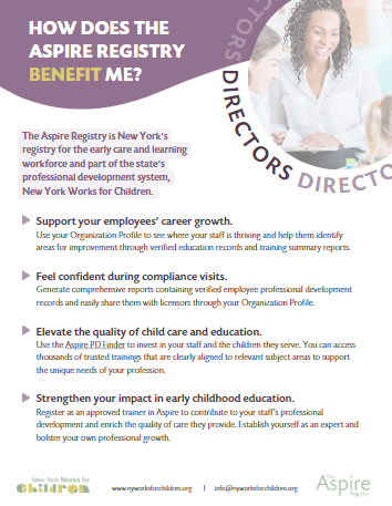 Every member of the Aspire Registry gains access to many benefits to help advance their careers in early care and learning! Our benefits one-pagers highlight all the key features in our system, which is designed to support Directors, Trainers, Family Child Care Providers, and Educators throughout their unique professional journeys.
