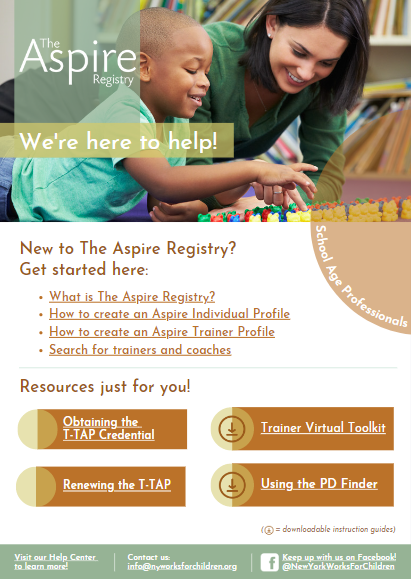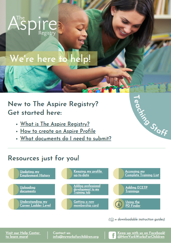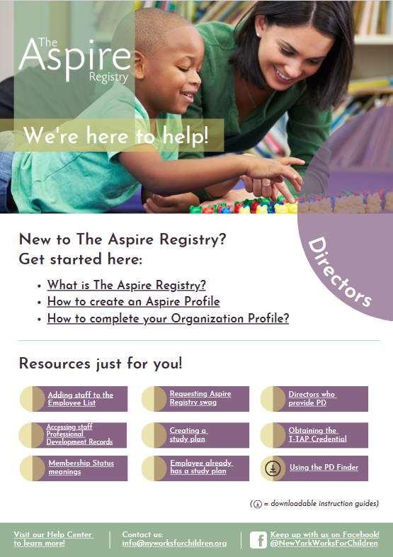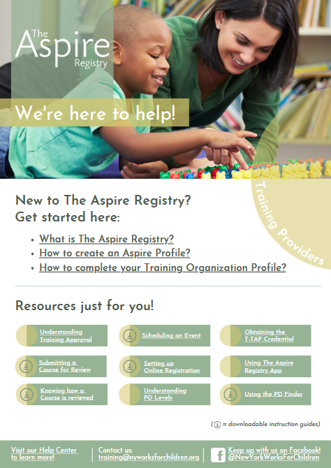 Below you will find role-based virtual tool kits created for the various users of The Aspire Registry. These online resources contain links to help center articles as well as downloadable guides to provide support and instruction when navigating our system.